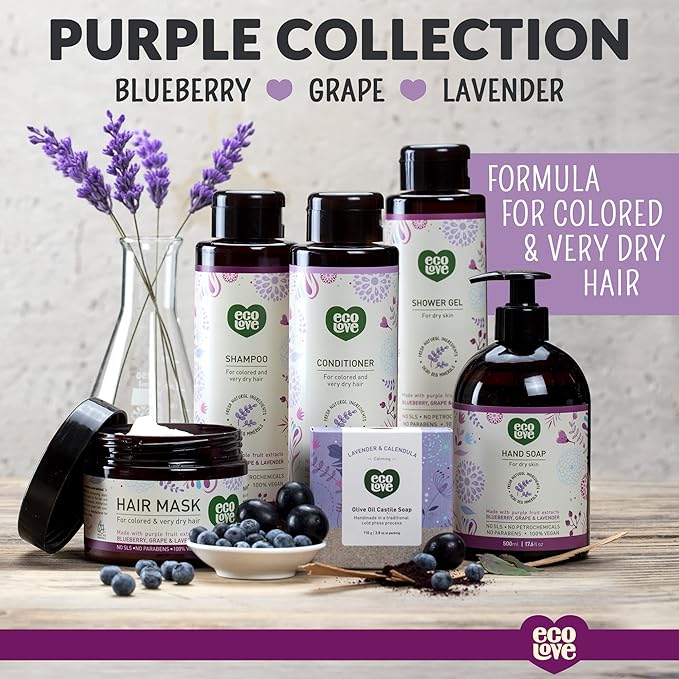 - NATURAL & ORGANIC INGREDIENTS: ecoLove Purple Collection Natural Shampoo is free from SLS, parabens and petrochemicals. 95% nature-derived ingredients (30% organic). Enriched with essential oils, organic herbs & plant extracts and 26 Dead Sea minerals.