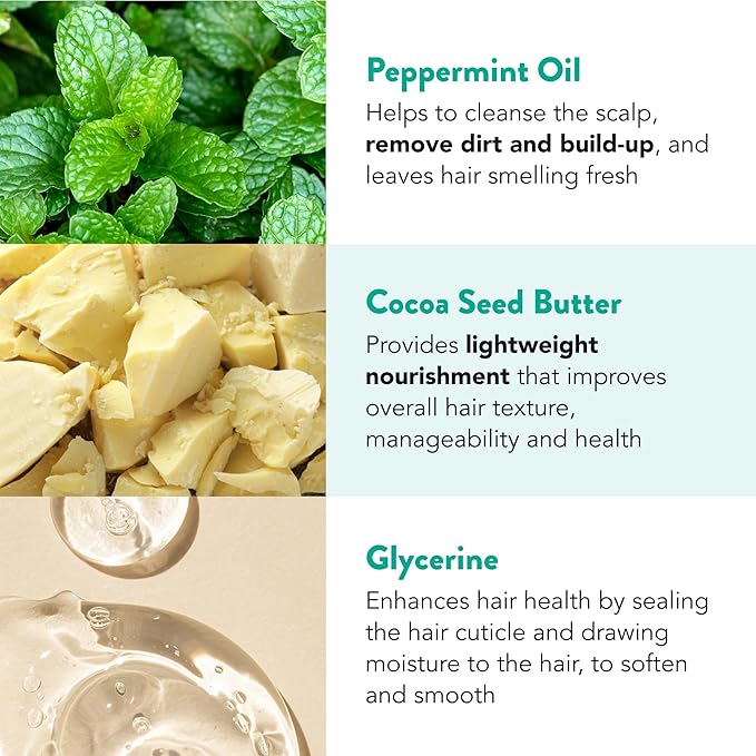 - Gentle Formulation: A delicate blend of babassu oil, betaine (from sugar beets), and cocoa butter helps achieve soft, shiny hair and a happy scalp without any sulfates, fragrances, or coconut oil.