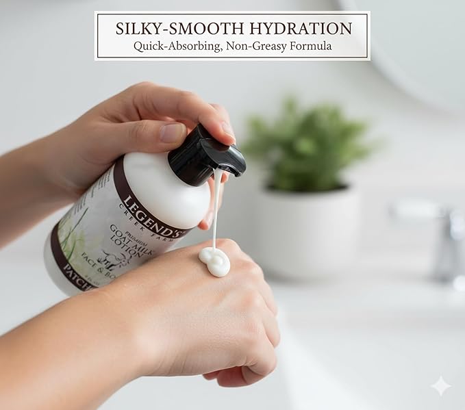 Legend's Creek Farm Goat Milk Lotion - Deeply Moisturizing Goat Milk Body Lotion for Body, Hand & Face - 9 oz Body Moisturizer with Shea Butter, Sunflower Oil, Aloe, Handmade in USA (Patchouli L.)
