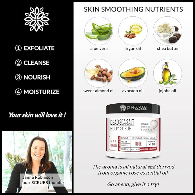 - GET ULTRA SMOOTH SKIN FAST - THIS WORKS! Our unique “4 in 1 Formula” does everything a body scrub should do and more - EXFOLIATE, CLEANSE, NOURISH & MOISTURIZE. Fine grain dead sea salt infused with essential oils, nutrients and skin softeners helps to smooth away rough, bumpy, and uneven textures to instantly reveal your true soft, healthy and radiant skin. You'll love the aroma of fresh roses!