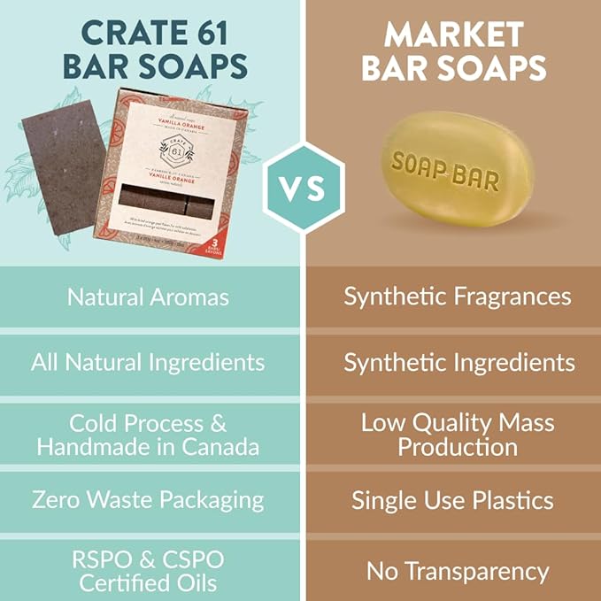 Crate 61 Organics, Handmade in Canada, Plant Based Cold Process Natural Bar Soap For Face And Body, With Premium Essential Oils, For Men And Women 3 Pack (Vanilla Orange)