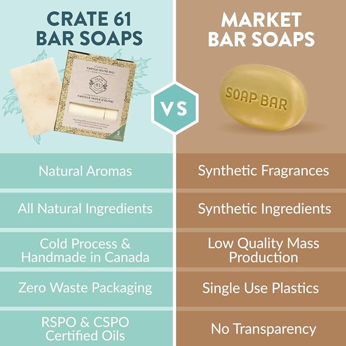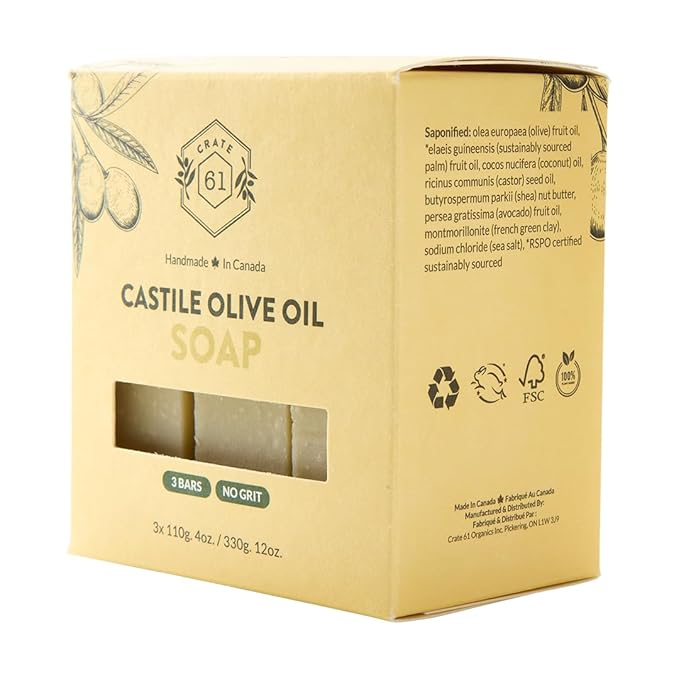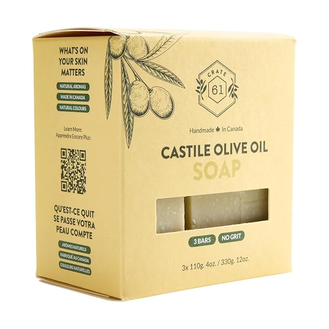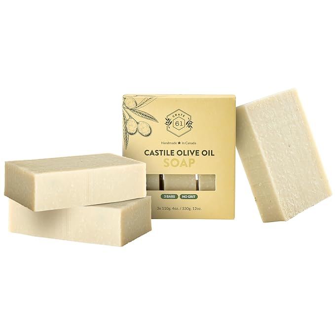 Crate 61, Handmade in Canada, Plant Based Cold Process Natural Bar Soap For Face And Body, With Premium Essential Oils, For Men And Women 3 Pack (Castile (Unscented))