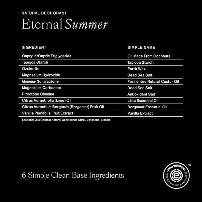 - Eternal Summer - This scent invites you to soak up the sun with notes of luscious coconut and a tropical twist of lime. Meanwhile, plush tapioca starch and conditioning coconut oil give this sensitive skin deodorant a smooth glide.