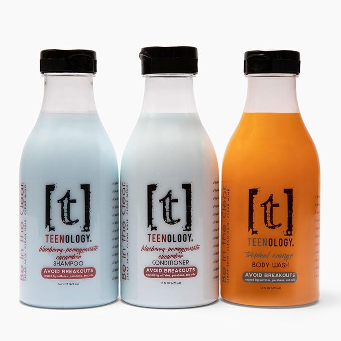 Teenology Shampoo, Conditioner, and Body Wash Bundle (Save 10%) - Sulfate and Paraben Free, Noncomedogenic, Natural Botanical Extracts, Blueberry Pomegranate Cucumber and Tropical Orange - 16 oz.