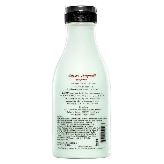 - ✓INGREDIENTS: TEENOLOGY Shampoo contains quality botanical extracts: vitamin B5 (repairs damage from sun), aloe vera (for healthy scalp and blood circulation), comfrey (for blemishes), blueberries (to help hair growth), pomegranate (smoothes frizzy hair), cucumber (opens pores), and sage (helps hair appear strong and shiny). The old-fashioned milk bottle container looks great in any shower or bath.