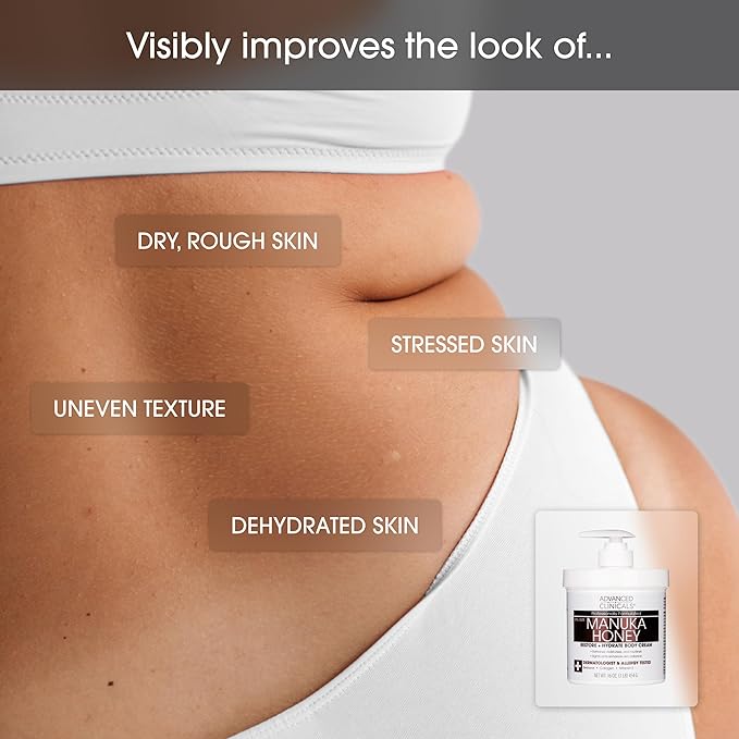- MANUKA HONEY BODY CREAM NOURISHES & SOFTENS DRY, ROUGH SKIN – This Manuka Honey + Collagen body cream provides hydration to soothe and replenish dry, textured skin. It promotes a softer, more comfortable complexion, leaving skin visibly renewed and nourished. Suitable body cream for women and men. This rich, velvety body moisturizing formula is rich like a body butter, but without a greasy finish. Skin feels smooth and hydrated for a visibly firm look.