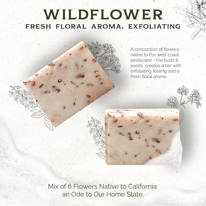 - WILDFLOWER: Immerse yourself in the gentle exfoliating power and fresh floral fragrance of this unique blend inspired by native West Coast foliage. Crafted with multiple flower oils, our wildflower soap offers a highly aromatic experience, leaving your skin feeling refreshed and renewed with a soft, powdery essence.