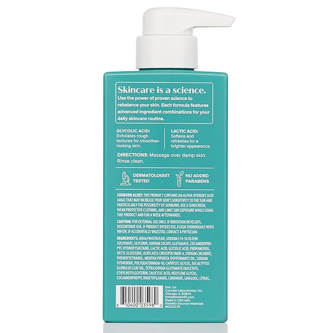 - EXFOLIATING FACE & BODY WASH FOR CLEAR SKIN: A foaming, sulfate free, Peppermint + Eucalyptus Oil scented, Glycolic Acid (AHA) + Lactic Acid Exfoliating Face Wash & Body Wash that will effectively soften dry flakey skin, help remove dead skin cells, promote cell turnover, target keratin build ups, freshen up skin tone, help prevent breakouts + clear ingrown hairs, target keratosis pilaris, & reduce rough + bumpy skin. Exfoliating body scrub for making skin feel softer, smoother, & more supple.