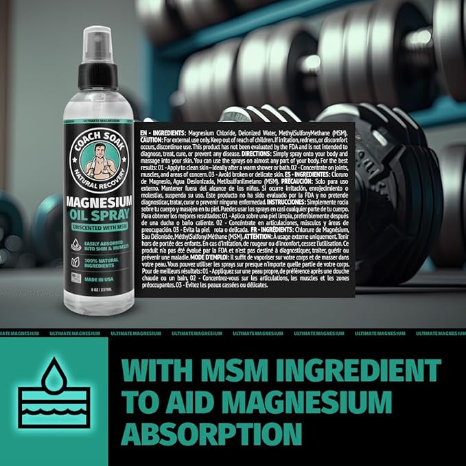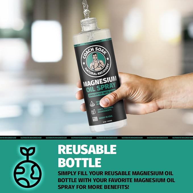 Coach Soak Magnesium Oil Spray with MSM - 8oz, Extra Magnesium Chloride Strength, 100% Pure Topical Spray for Feet & Body, Unscented - Made in USA