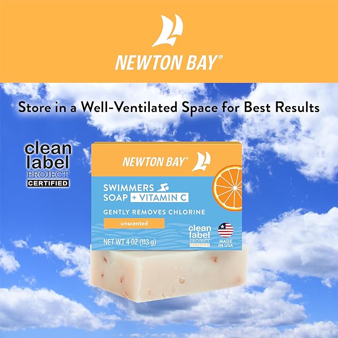 - ENHANCED NATURAL FORMULA: Newton Bay Swimmers Soap + Vitamin C is an enhanced version of Newton Bay's original chlorine removal soap. Formulated to overcome stubborn chlorine damage, Swimmers Soap + Vitamin C includes the same, short list of high quality, all-natural, vegan ingredients as Newton Bay's original Swimmers Soap plus the chlorine neutralizing power of vitamin C. Swimmers Soap does not contain any sulfates, parabens, phthalates, or added fragrance. Our RSPO-certified palm oil is sustainably produced, wildlife friendly and fully traceable.