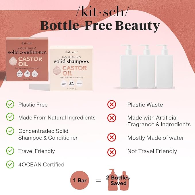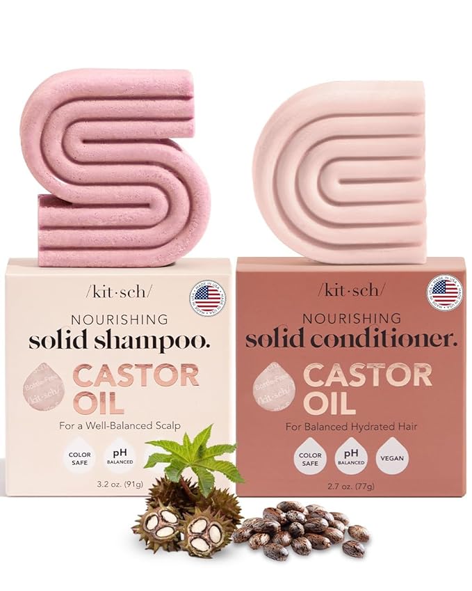 Kitsch Castor Oil Shampoo and Conditioner Set for Dull & Dry Hair - Nourishing Bar Soap for Well-Balanced, Hydrated Hair, Vegan, Strengthening Hair Care, Paraben-Free & Sulfate-Free, Made in US - 2pcs