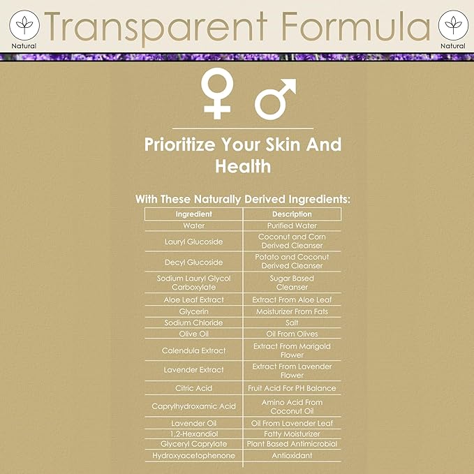 - Nourishing Cleanse: Olive oil, aloe vera extract, and lavender extract leave your skin feeling soft, smooth, and refreshed.