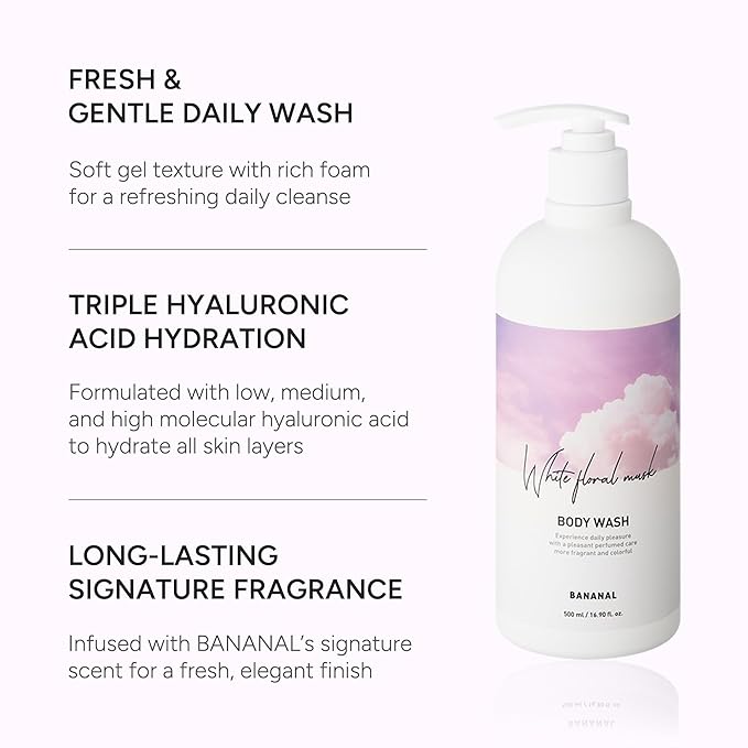 Korean Body Wash with Hyaluronic Acid & Aloe – Hydrating Moisturizing Cleanser for All Skin – Infused with Natural Extracts – Paraben & Silicone-Free – White Floral Musk, 500ml / 16.9 fl oz