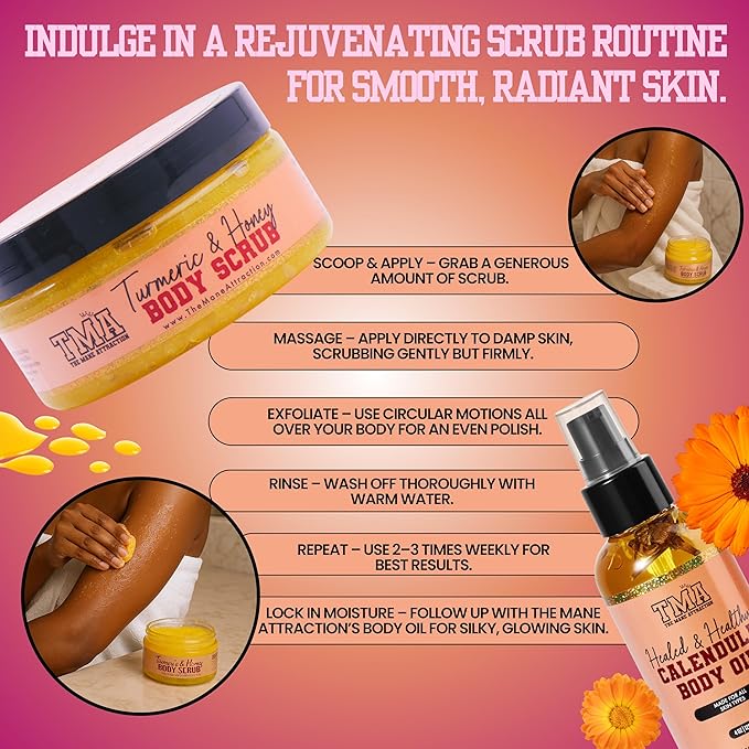 - Brightens & Evens Skin Tone – Infused with turmeric root extract & honey, this body scrub gently removes dead skin cells, reduces hyperpigmentation, and reveals a radiant glow.